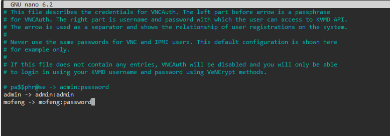 对于使用VNCAuth身份认证的VNC客户端(即只需使用密码不需要输入账户的VNC客户端),如果修改了PiKVM程序密码后,此身份认证文件不会自动修改,需手动在文件/etc/kvmd/vncpasswd修改或添加密码映射。添加内容为“自定义VNC密码 -> WEB账户:WEB密码”,如下为示例:
