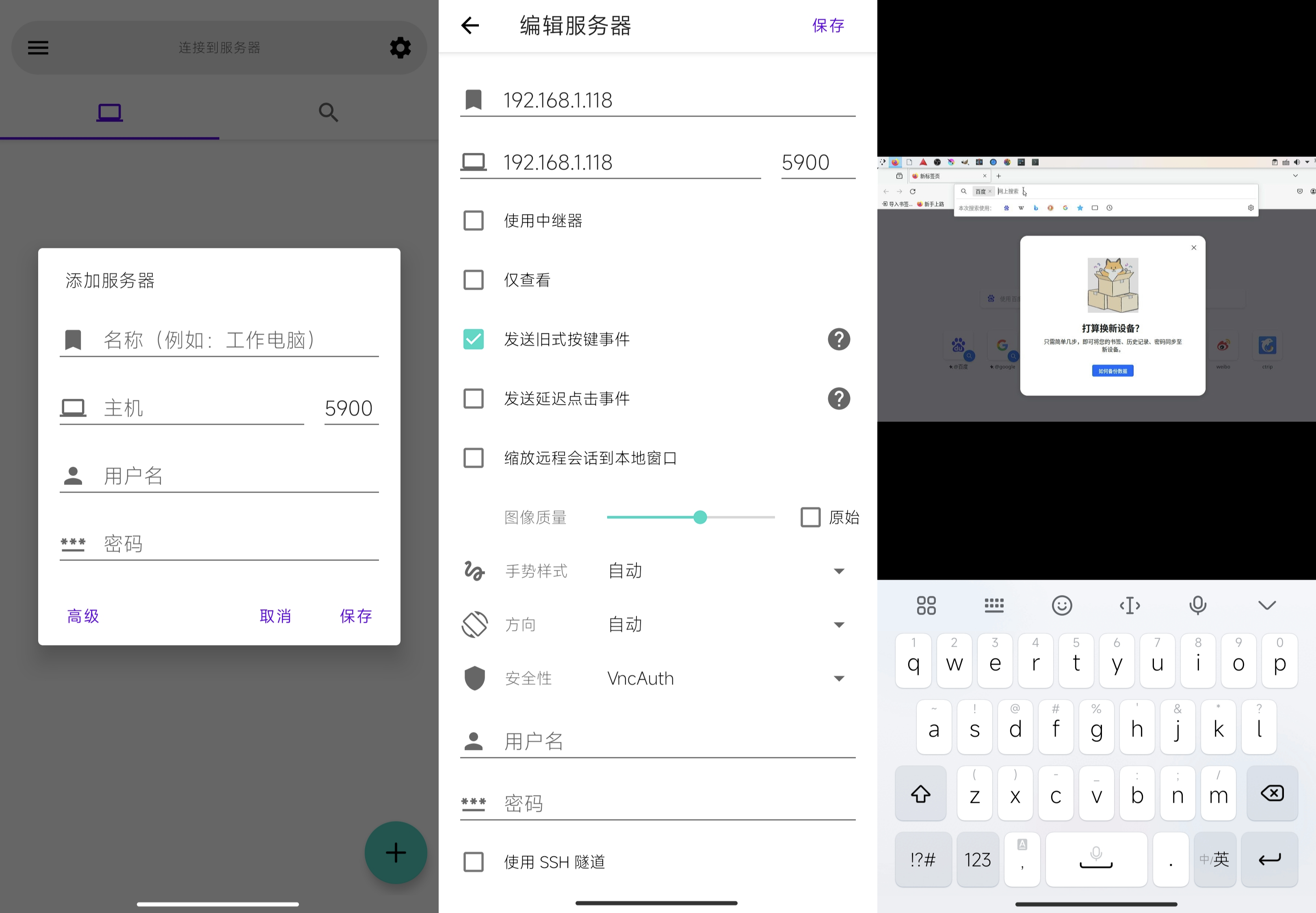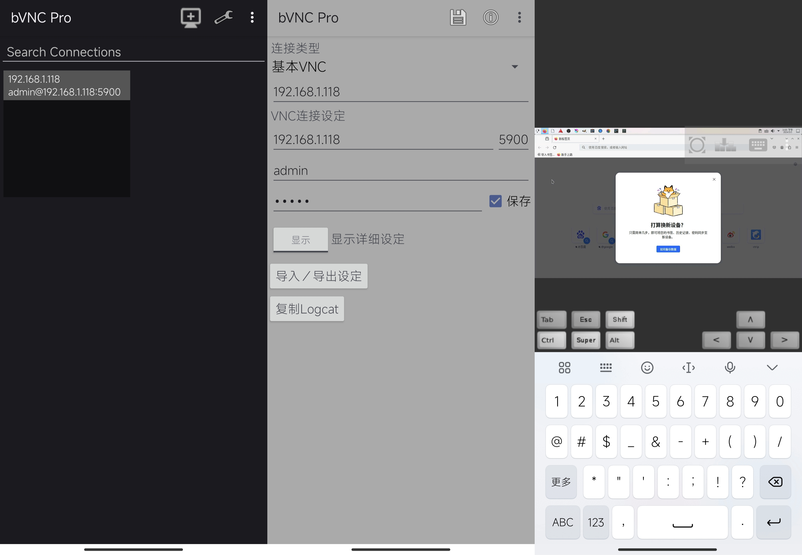 对于安卓移动端,可以使用AVNC和bVNC Pro这两个开源软件。两个应用的操作手势都支持触摸屏和触摸板。对于AVNC应用,不能使用默认的安全性设置,需手动修改安全性为Vncauth才能正常连接PiKVM VNC。