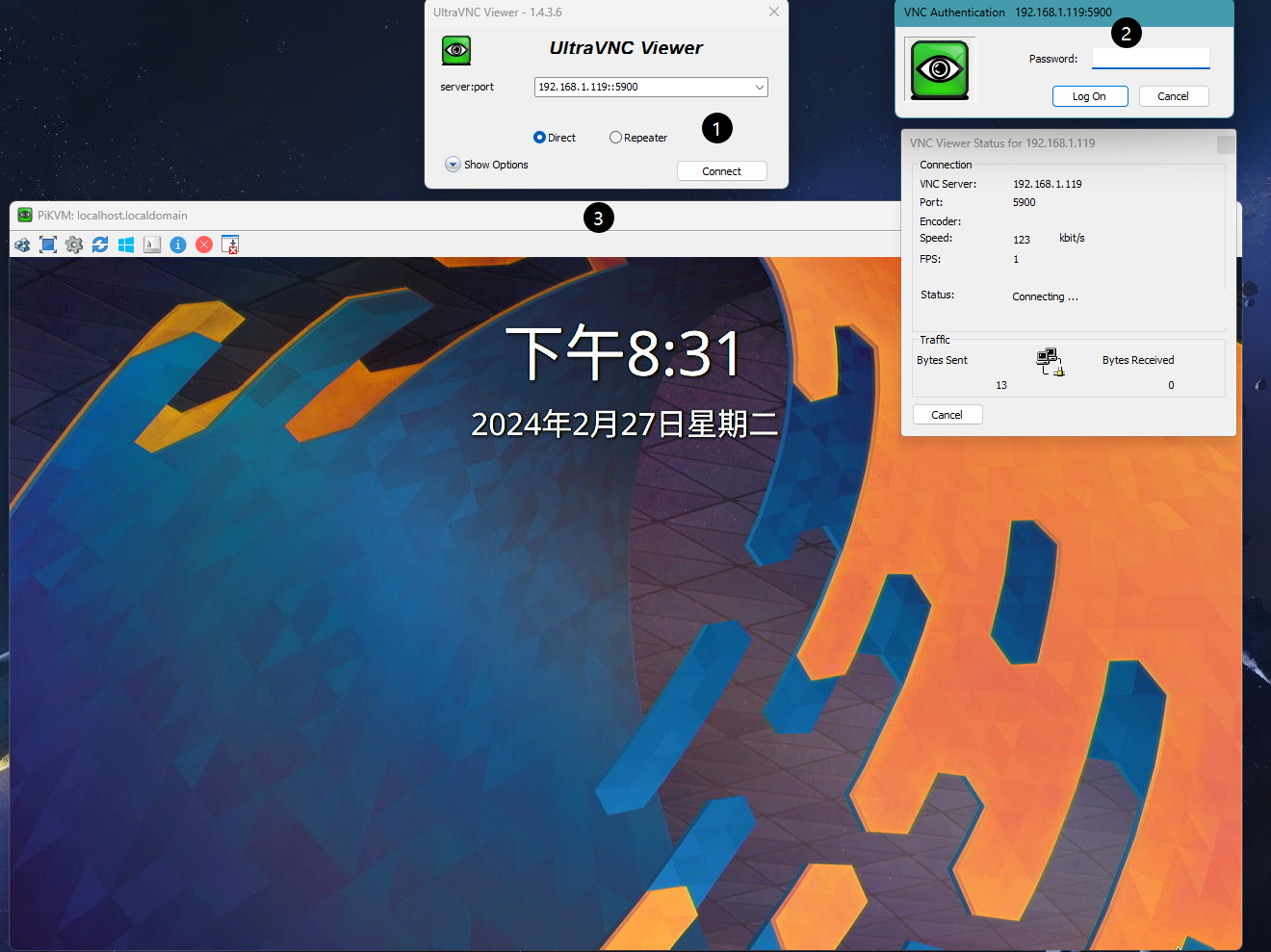 对于 Windows,可以使用 UVNC 和 TigerVNC,可在网盘下载(位置:/S805远控盒子/PiKVM相关软件/)。下面是 UVNC 的使用示例。