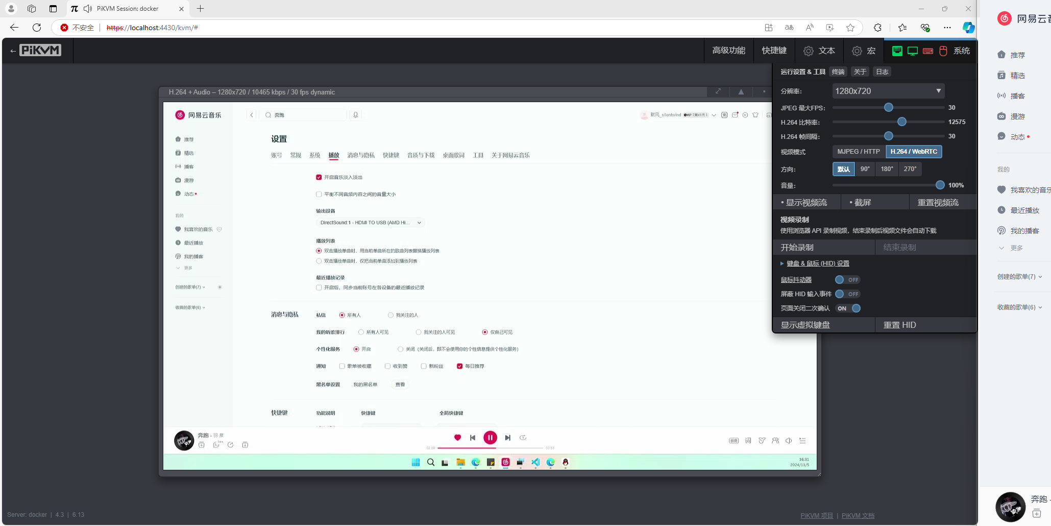 PiKVM 最新版本支持通过 H.264/WebRTC 实时传输 HDMI 音频,音质足够流畅地播放音乐。系统使用 Linux ALSA 声卡驱动,由 ustreamer 和 janus 负责采集 HDMI 音频并转码为 opus 格式。