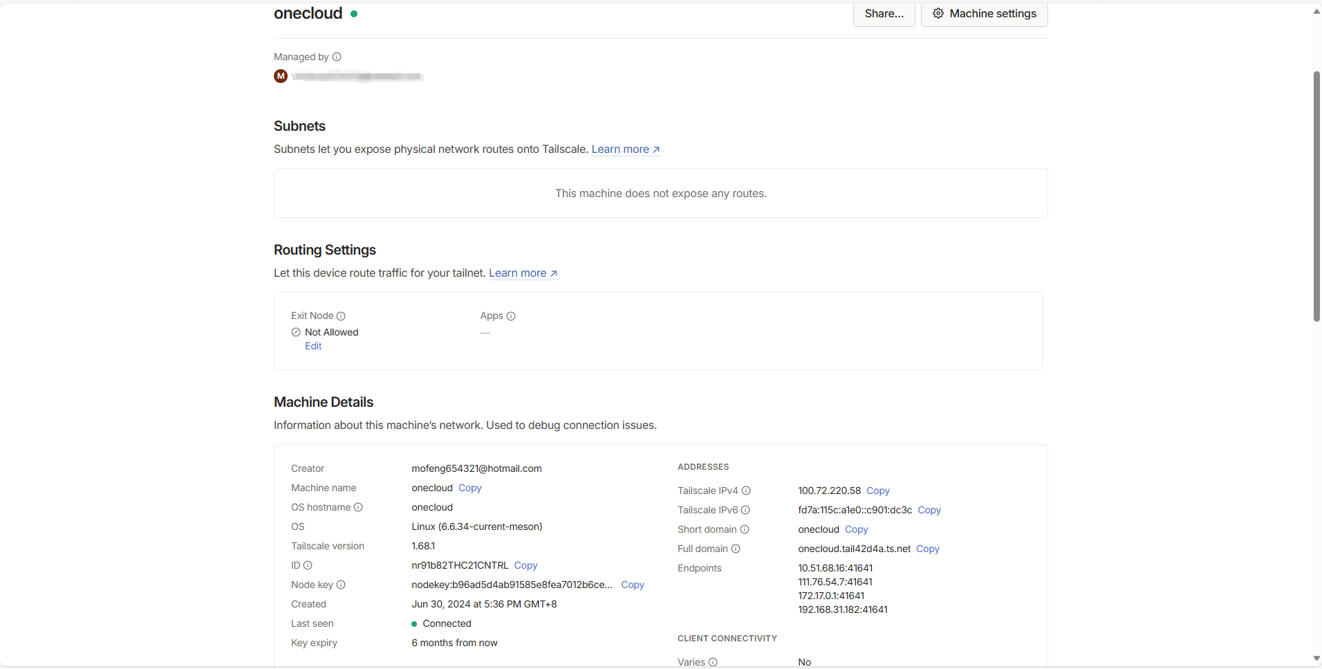 - 登录成功后,可以在 Tailscale 管理后台看到新添加的设备: